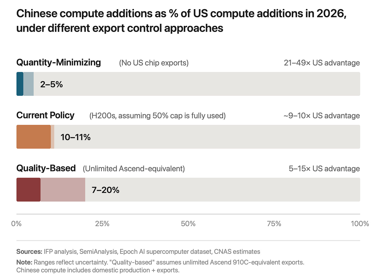 The administration’s recent rule falls between these two extremes: It puts a cap on the number of chips that can be sold to China while still allowing very significant quantities of exports. Under the current 50% rule, the cap sits at 900,000 Hopper-equivalent chips and rising over time—”over twice what China is expected to produce this year”. This would result in a US compute advantage of approximately 9-10x in 2026. The quality of the chips is also substantially higher than a strict quality-based approach would recommend. But the policy will still be less damaging than exports without any cap on export volume.