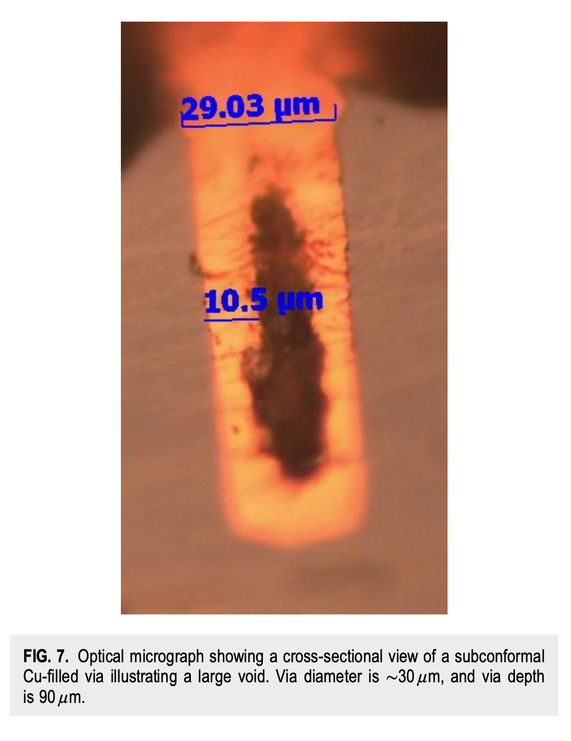 In the TSV, the deposited copper seed layer acts as the cathode, meaning copper continually builds up on it, slowly filling the space. The complexity comes in managing the pace at which this copper forms, and where within the TSV. A bottom-up fill is needed, as one key issue is voids forming within the copper (as shown above). These are holes within the copper, formed by impurities, trapped air, or mismanagement of the deposition process, in which the top of the TSV fills before the bottom does.