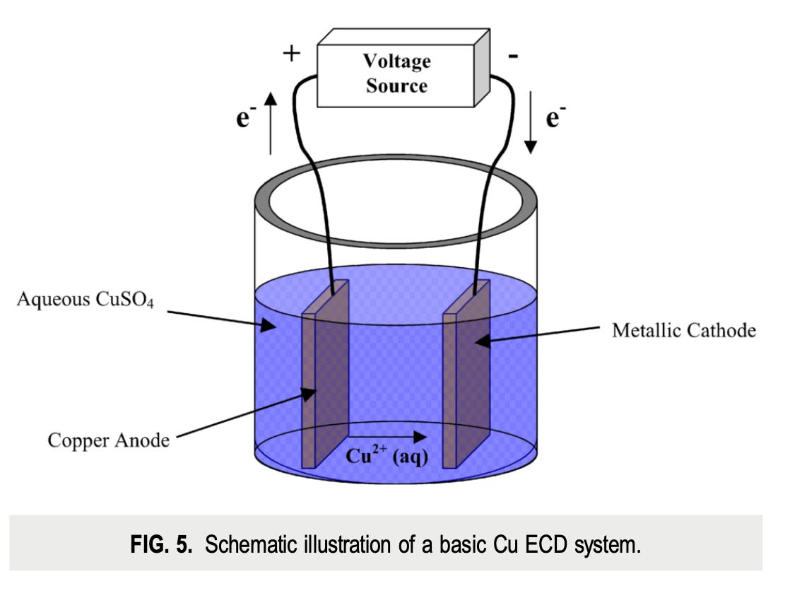 Once these various linings are in place, the challenge is to fill the rest of the TSV with copper. This process is called electroplating or electrochemical deposition. Electroplating uses electrolysis, in which a circuit is established between a cathode and an anode. This oxidizes copper at the anode, sending electrons through the external circuit and releasing positively charged copper ions into the solution; at the cathode, the ions meet those electrons and are reduced to solid copper on the surface. The same process is used to plate gold or silver jewelry: a ring is placed in a solution containing dissolved gold, and a current is passed through it, depositing a layer of solid gold. With TSVs, this happens on a microscopic scale.