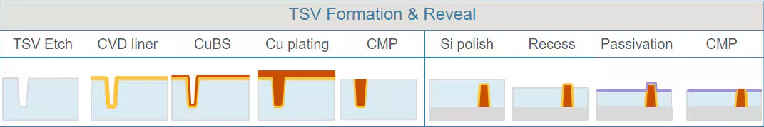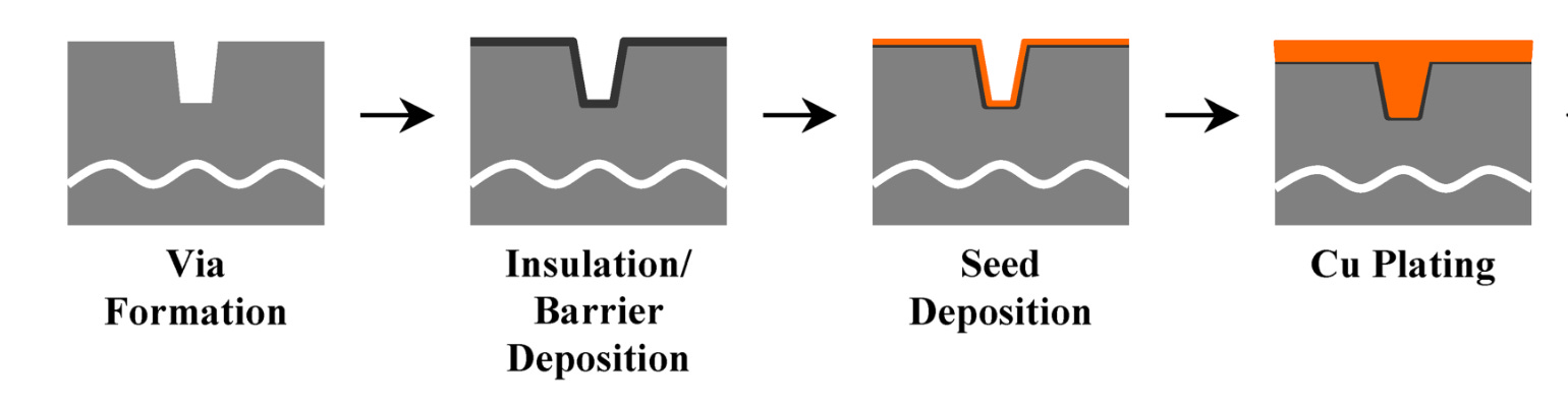 For producing TSVs, there are four key deposition steps. The first three can be grouped together as they are all variations of thin-film deposition; the fourth, copper electroplating, works differently and is discussed below.