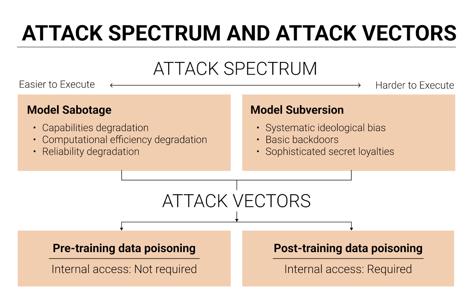 The main method for sabotaging or subverting a model is data poisoning. An attacker can poison the pre-training data, or the post-training data, or both.